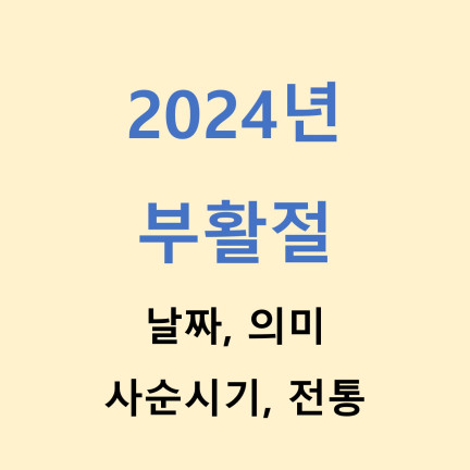 2024년 부활절 (주님 부활 대축일) 2024년 3월 31일 일요일 (춘분 후 만월(보름) 다음 일요일) 부활절 의미 부활절은 그리스도교 세계에서 가장 중요한 축제 중 하나로, 예수 그리스도의 부활을 기념하는 날입니다. 부활절은 그리스도의 죽음과 부활을 기념하여 그리스도교 신자들에게 큰 의미를 부여합니다. 부활절은 예수 그리스도가 십자가에 못 박혀 죽음을 당한 후 세 번째 날에 부활하신 것을 기념합니다. 이는 그리스도인들에게 새로운 삶과 구원의 희망을 상징합니다. 부활절의 의미는 우선적으로 신앙의 중심에 있습니다. 그리스도인들은 부활절을 통해 예수 그리스도의 신성한 존재와 구원의 계획을 기억하고 축하합니다. 예수의 부활은 그리스도인들에게 죽음의 권세를 이기고 영생의 희망을 주는 신앙적 이벤트로서, 그들..