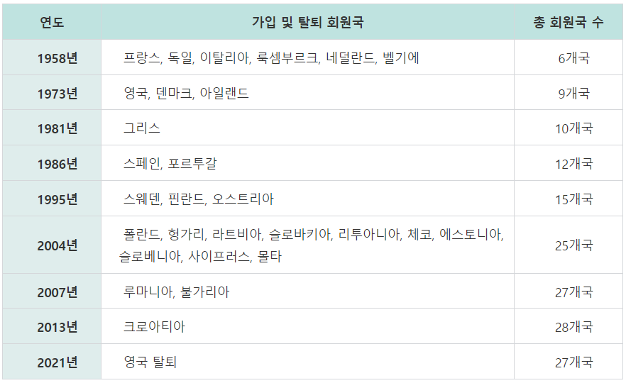 유럽연합 국가의 가입 및 탈퇴 연도는 다음과 같습니다.